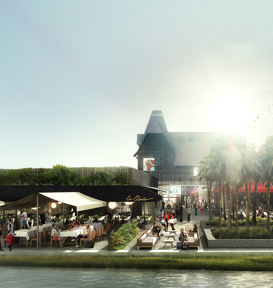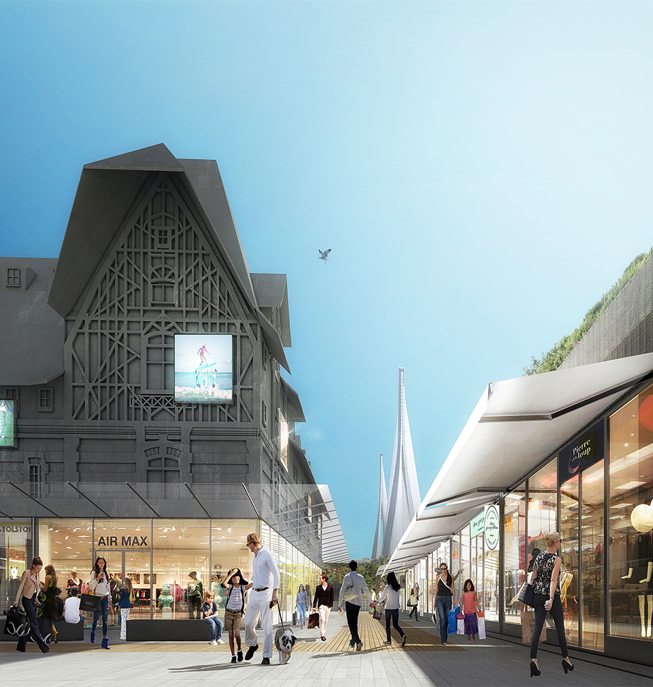 Construction et intégration d’un centre commercial de marques, au pied du pont de Normandie. Magdus Award 2010 du « Meilleur projet de centre de marques en Europe ».