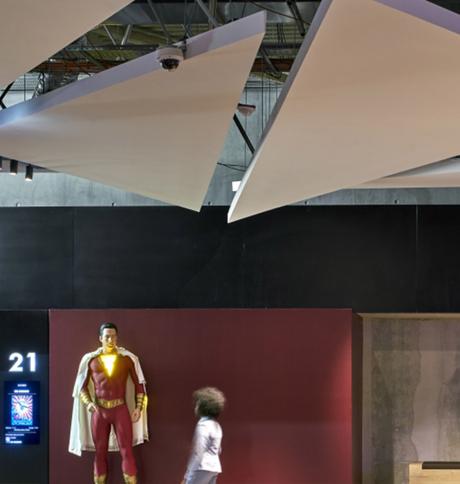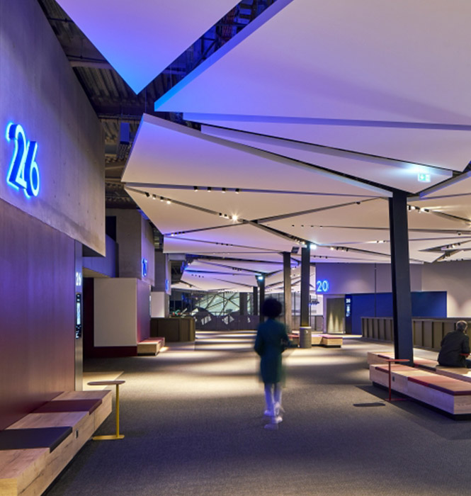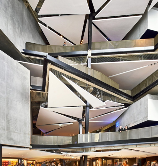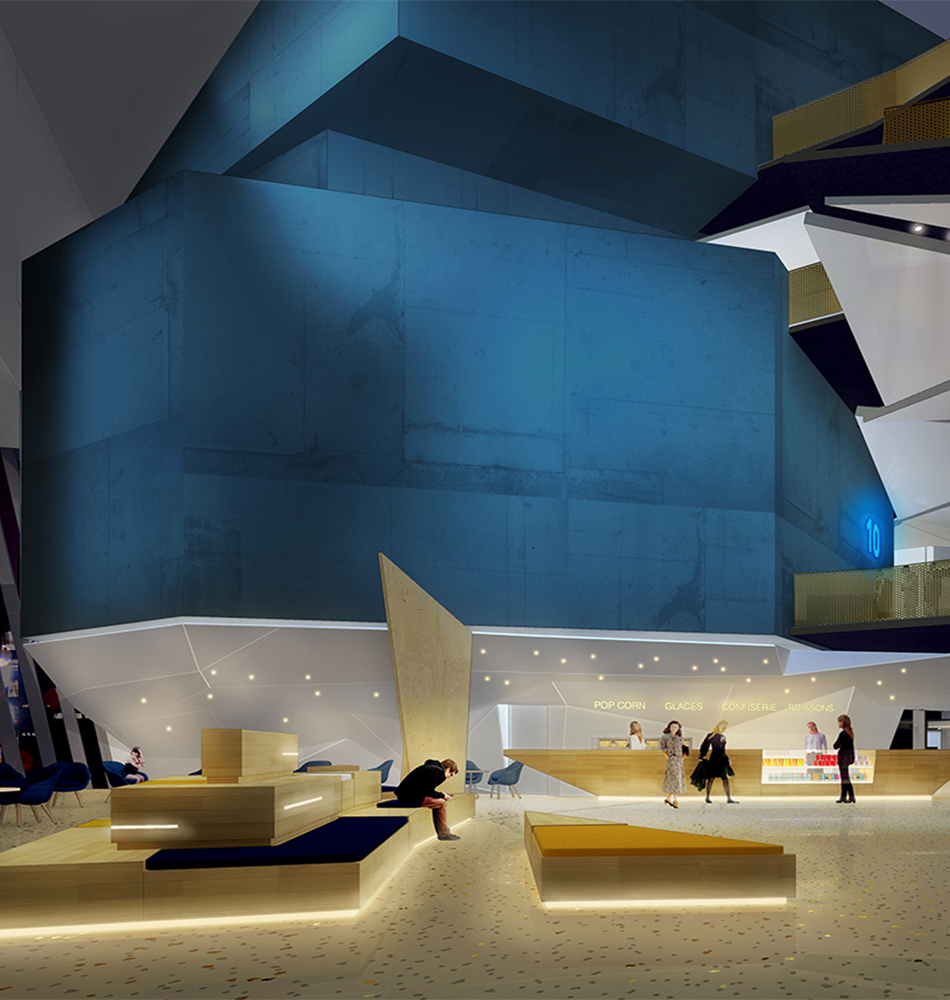 Aménagement de 18 salles (3 800 places) de cinéma dans le cadre du projet de rénovation et d'extension du centre commercial de Vélizy 2. Les salles de cinéma sont assemblées le long de rues suspendues, avec des salons développés comme des antichambres, des belvédères, des espaces ouverts. Les volumes intérieurs sont mis en scène par une scénographie lumineuse et des mobiliers.