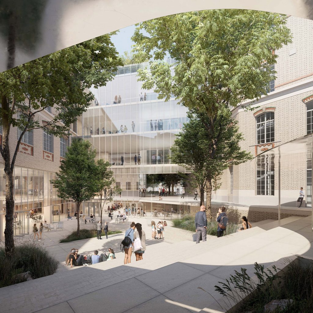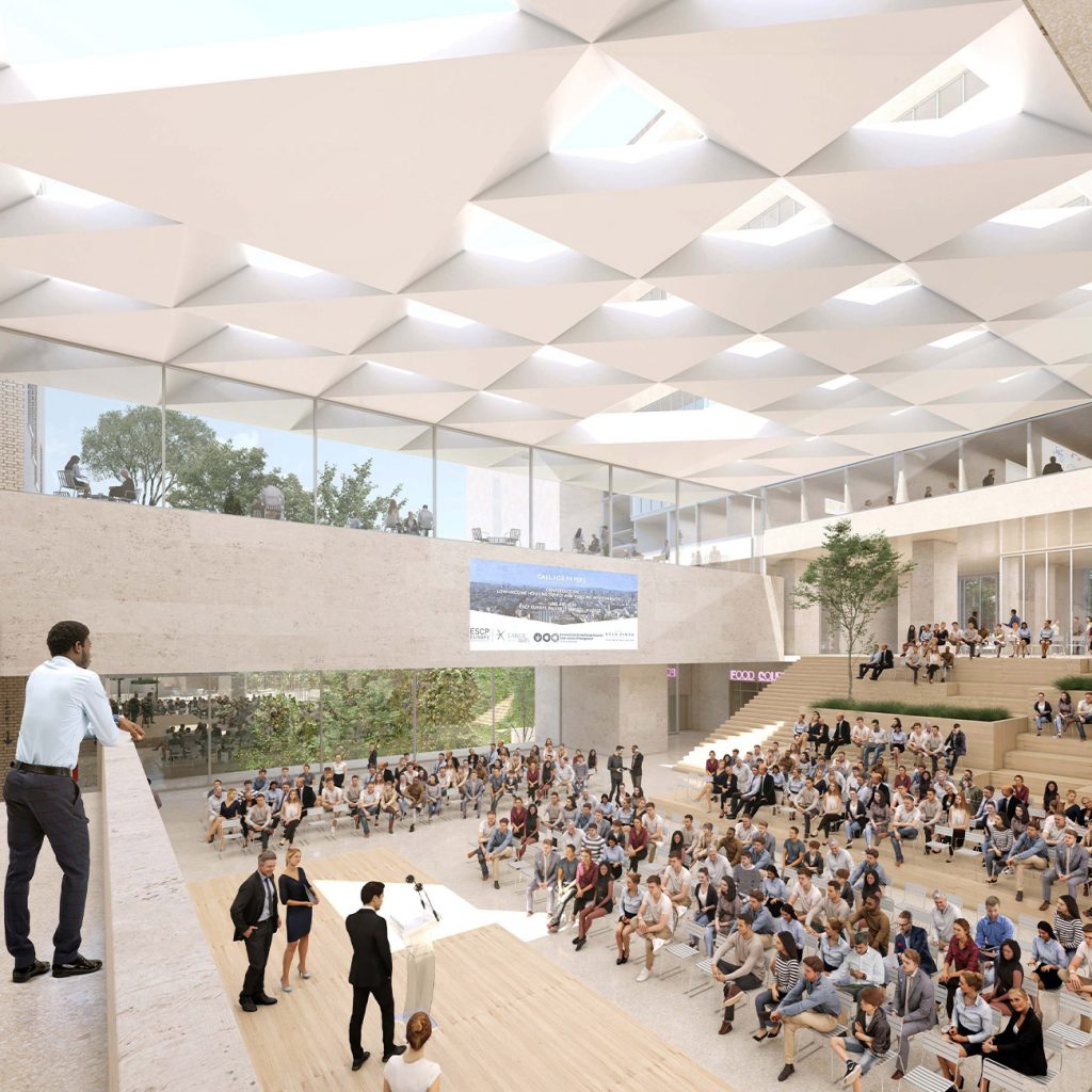 ESCP Business School Paris, la plus ancienne école de management française va rénover en profondeur son site historique datant du XIXème siècle. Un campus tout en verticalité, dont l'ouverture est prévue en 2027, qui sera notamment doté - d'une vaste cour centrale arborée, - de nombreux espaces de coworking, - de 3.000 mètres carrés de terrasses étagées, - d'un rooftop avec vue panoramique sur la capitale ou encore d'une brasserie. Le site sera parcouru de passerelles en verre et autres passages permettant une meilleure connexion et circulation entre les différents bâtiments, pour le moment très cloisonnés.