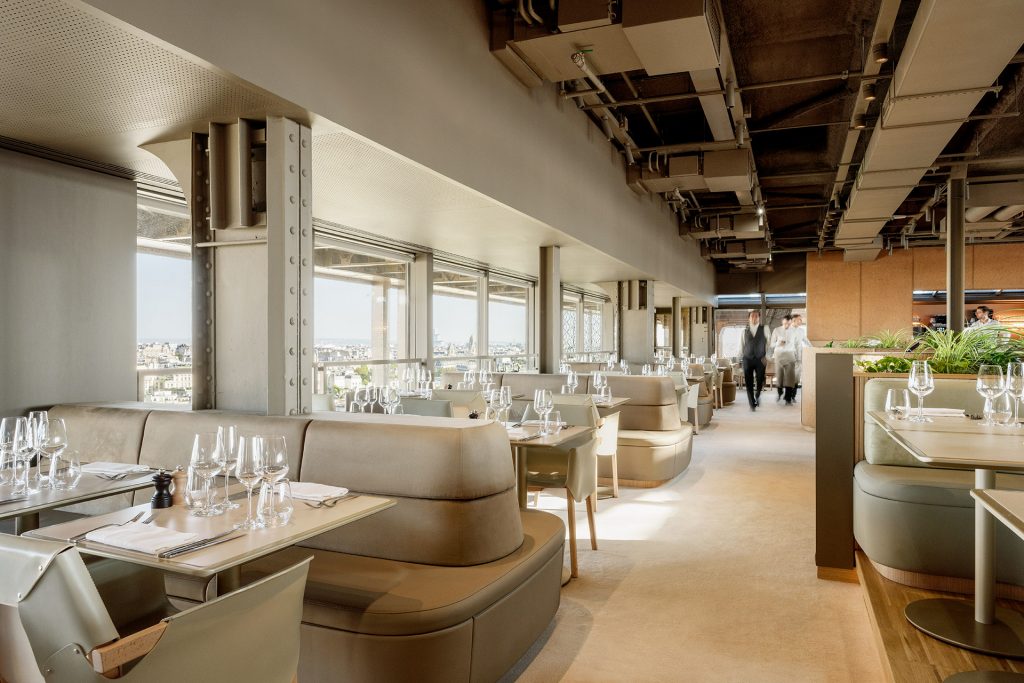 La brasserie du premier étage de la Tour Eiffel, rebaptisée « Madame Brasserie » a rouvert ses portes le lundi 06 juin. Aux fourneaux Thierry Marx, le chef doublement étoilé propose une expérience gustative dans un cadre cosy et des espaces totalement repensés. Les talentueux Ramy Fischler et Nicola Delon respectivement designer et architecte du projet ont privilégié des matériaux durables et responsables comme du bois brut, du liège, de la terre crue qui cohabitent avec des poutres métalliques de la « Grande Dame » habilement mis en valeur afin de renforcer l’identité du lieu. De grandes baies vitrées offrent sur chaque côté une vue imprenable et panoramique sur la capitale.