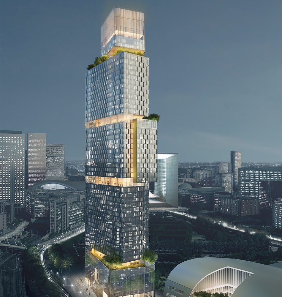 Construction d'une tour IGH comprenant : un centre d'affaires, un hôtel Holiday Inn d'environ 450 chambres, un hôtel Staybridge Suites d'environ 300 chambres, un hôtel Crowne Plaza de 350 chambres, un belvédère public avec un restaurant panoramique et un parking de plus de 300 places. Projet mis en œuvre avec une démarche BIM. Projet récompensé : Lauréat BIM d'Or.