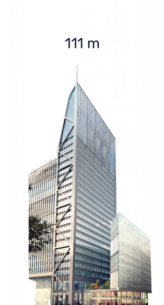 Construction d’une tour de bureaux (IGH) dans le quartier d’affaires de la Part-Dieu à Lyon. Le projet prévoit de réhabiliter les 18 niveaux existants de la tour EDF, d’accoler contre la façade nord de la tour existante, une deuxième tour de 23 niveaux, d’intégrer un socle commun (comprenant un auditorium, un restaurant interentreprises, une conciergerie et un parking) et de réaliser un bâtiment de 8 niveaux.