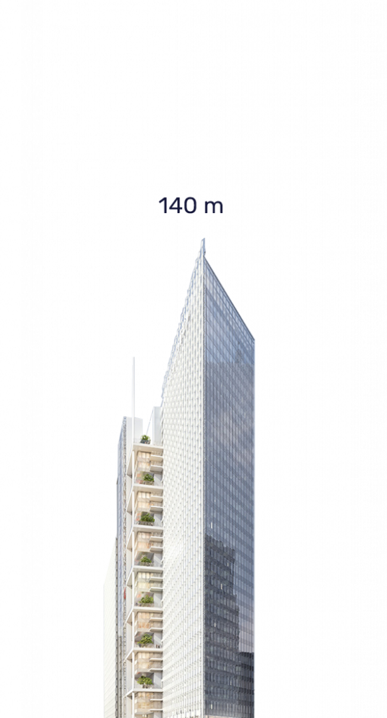Construction d’un ensemble immobilier tertiaire de grande hauteur (IGH). Le projet comprend un bâtiment de bureaux, un restaurant interentreprises, une aire de livraison, des commerces et services qui intégreront directement le quartier. Son parvis sera conçu de façon à améliorer les liaisons piétonnes. Son objectif est d’atteindre les certifications HQE, BBC et BREEAM Excellent.